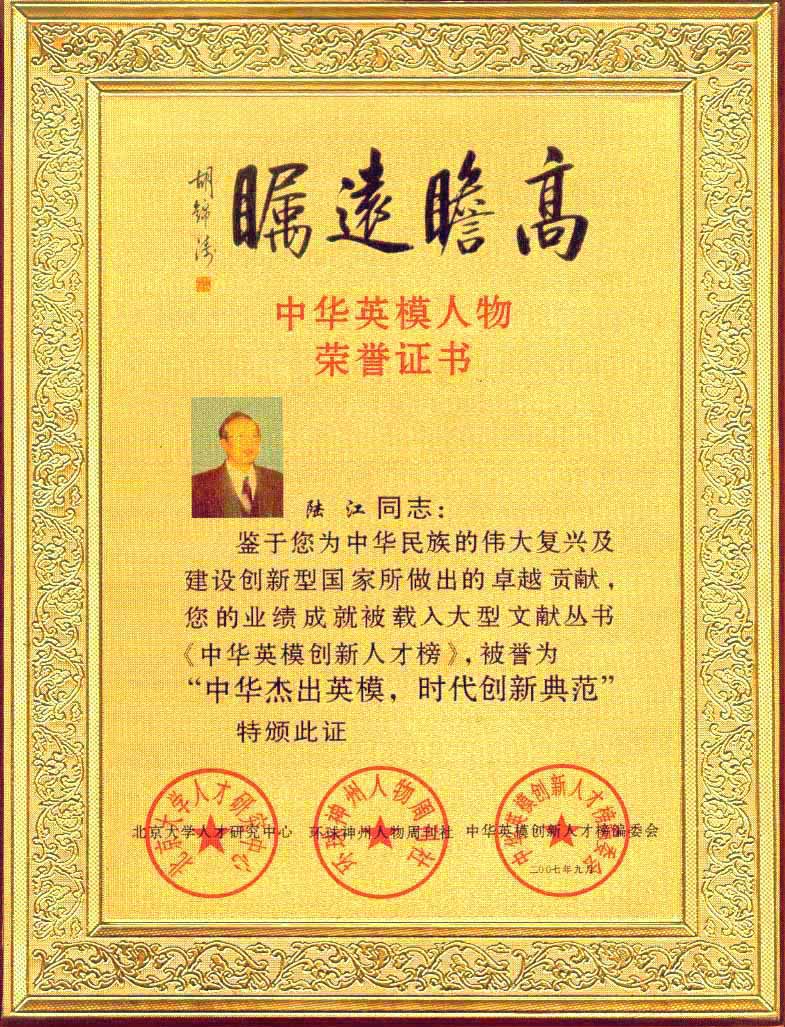 陸江的杰出貢獻被人民日報社評為先進個人